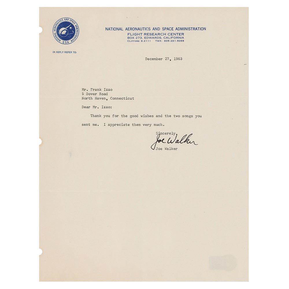 TLS, one page, 8 x 10.5, NASA Flight Research Center letterhead, December 27, 1963. Letter to Frank Izzo, in full: "Thank you for the good wishes and the two songs you sent me. I appreciate them very much. In fine condition, with three partial binder holes to the left edge, and light show-through at the bottom edge from a Beckett sticker on the back. A desirable letter by this hard-to-find test pilot.
