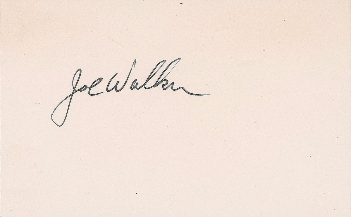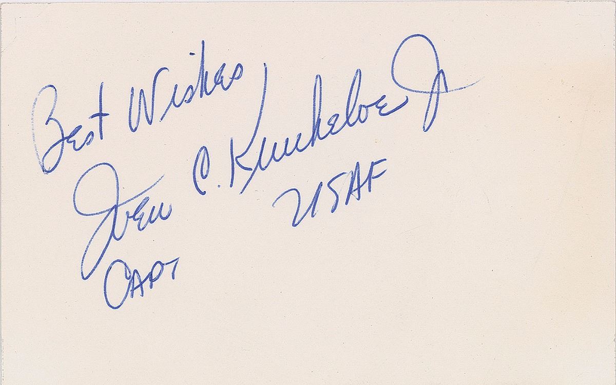 Two signatures: an off-white 5.25 x 3.25 card signed in black ink by famed X-15 pilot Joseph Walker, “Joe Walker,” bearing a collector’s ink notation on reverse dating the signature to March 30, 1962; and an off-white 5.25 x 3.25 card signed in blue ballpoint by storied American test pilot and fighter ace Iven Kincheloe, “Best Wishes, Iven C. Kincheloe, Jr., Capt. USAF,” bearing a 1958 date stamp on the reverse. In overall fine condition.