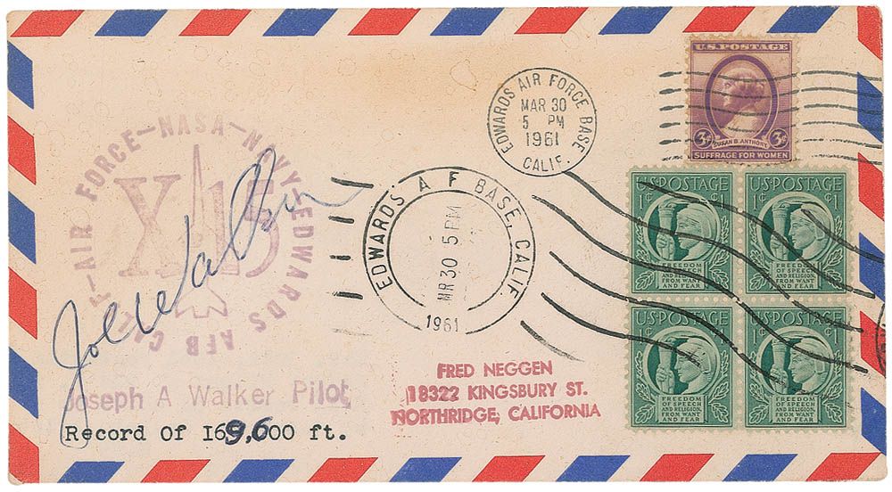 Postal cover bearing a March 30, 1961, Edwards Air Force Base cancellation and stamped X-15 cachet with the text “Record of 169,600 ft.,” signed over the cachet in blue ink by Walker. Scattered toning, an ink correction to the record, stamped address, and slight irregular adhesion to the signature, otherwise fine condition. Any item signed by Walker is quite scarce, more so in philatelic material.