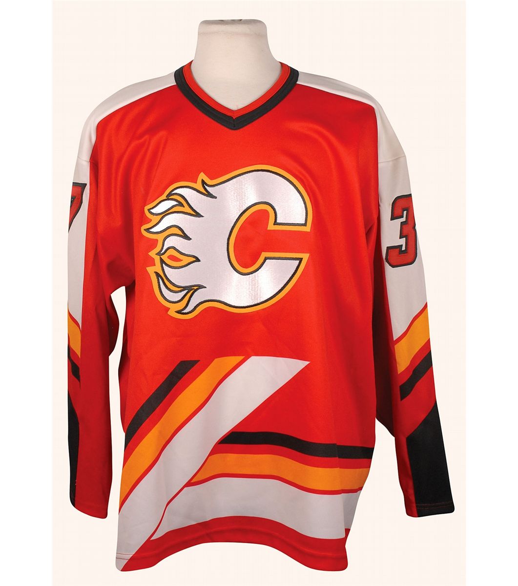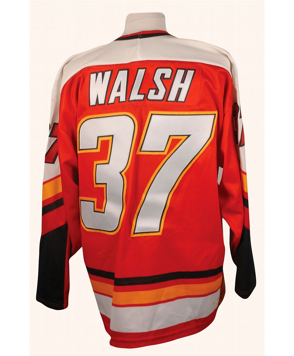 Official CCM Calgary Flames hockey jersey, with sewn on numbers and letters, number 37, with Walsh’s name on the back. In fine condition, with some scattered light soiling and most of label along bottom hem missing.