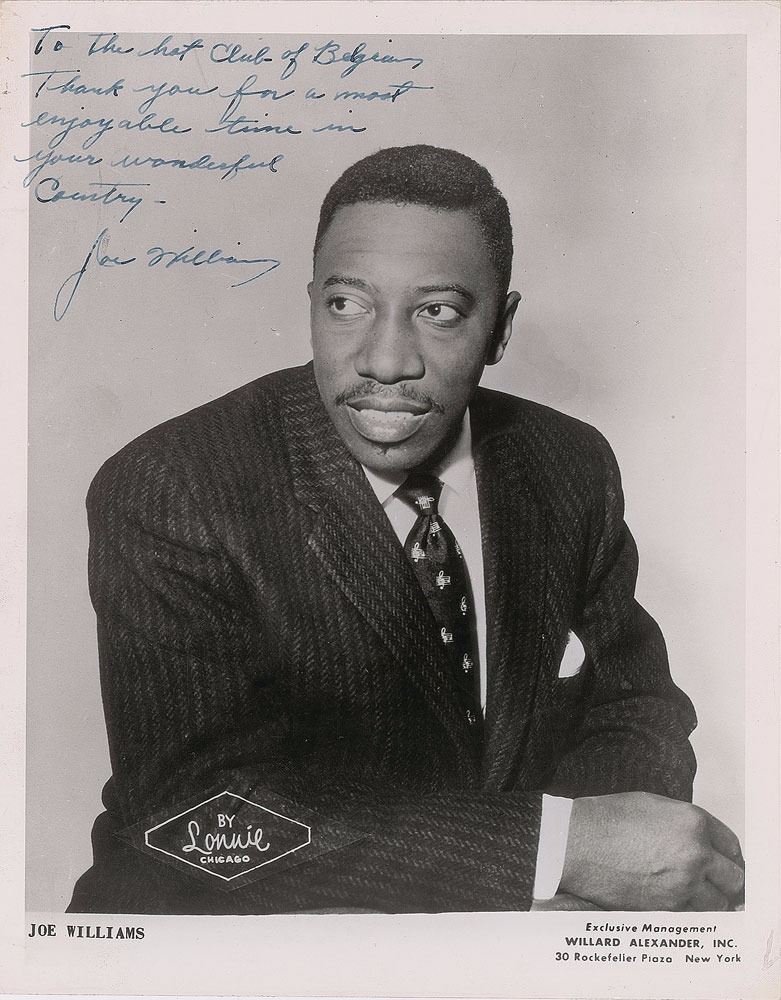 American jazz singer (1918–1999) who sang with big bands such as the Count Basie Orchestra and the Lionel Hampton Orchestra. Scarce vintage glossy 8 x 10.25 publicity photo of Williams in a half-length pose by Lonnie of Chicago, signed and inscribed in fountain pen, "To the Hot Club of Belgium, Thank you for a most enjoyable time in your wonderful country—Joe Williams.” Reverse bears a H. J. Mydtskov copyright stamp. In fine condition.
