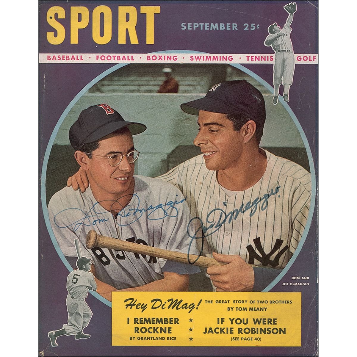 Sport magazine, dated September 1947, featuring the DiMaggio brothers posing in the dugout, signed in the cover in blue felt tip, “Dom DiMaggio” and “Joe DiMaggio.” In fine condition, with light creasing and mild wear to the edges and corners.
