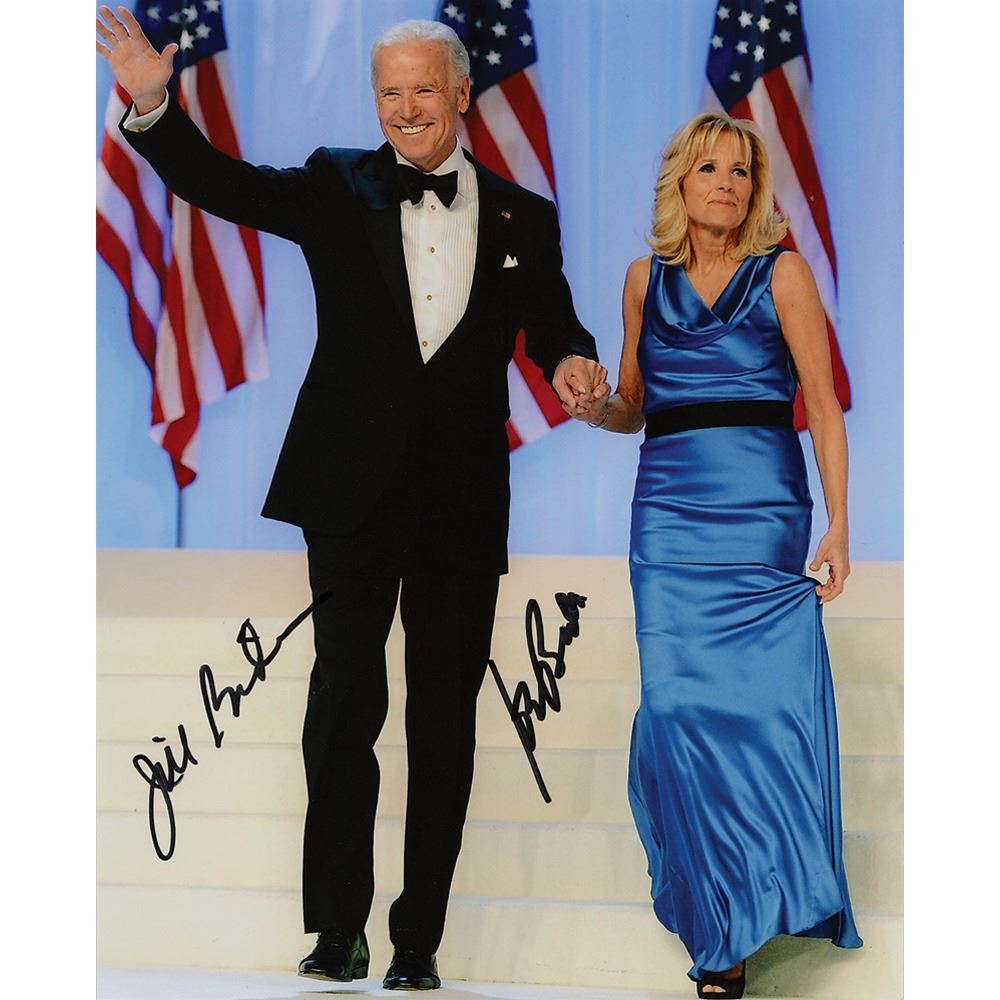 Color satin-finish 8 x 10 photo of Joe and Jill Biden holding hands during the inaugural ball on January 21, 2013, signed by both in black felt tip. In very fine condition. Accompanied by a certificate of authenticity from JSA.