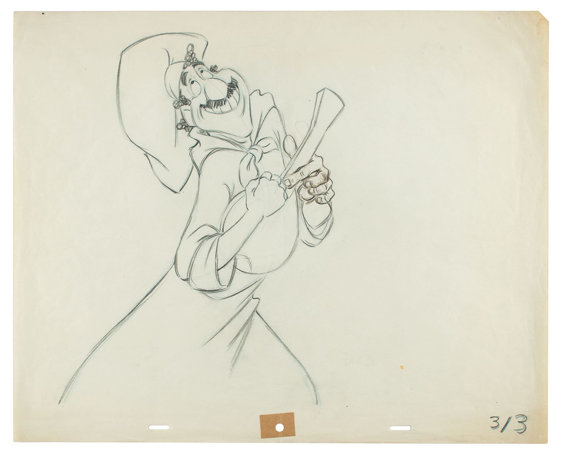 (Walt Disney Studios, 1955) Original production drawing by John Lounsbery featuring Joe from Lady and the Tramp, showing the cook at Tony's Italian Restaurant. Accomplished in graphite on untrimmed 15.5 x 12.5 animation paper, marked "313" in the lower right. Image measures 8.5 x 11. In fine condition, with one clipped corner tip. John Lounsbery, one of Walt Disney's master animators and known as part of the 'Nine Old Men,' supervised the animation of Tony and Joe singing and playing the accordion and mandolin during the memorable 'Bella Notte' sequence.