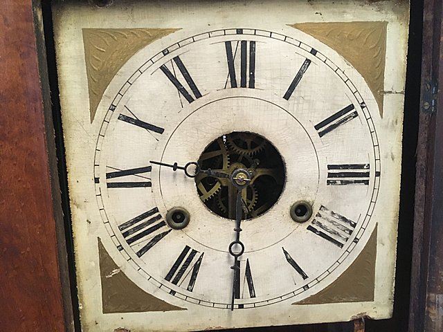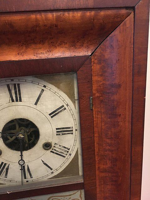Joel A. Lane OG Shelf Clock, c. 1840's, Southington, CT. 30 hour, early brass works, weight driven with reverse painted lower glass, label, "Clarks, Manufactured and Sold by Joel A. Lane, Southington, CT. (some loss on label). Measures approx. 26" tall x 16 1/2" wide x 4 1/4" deep.