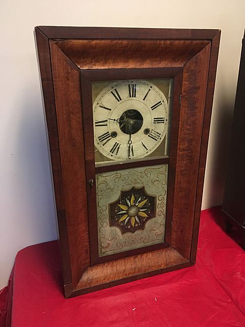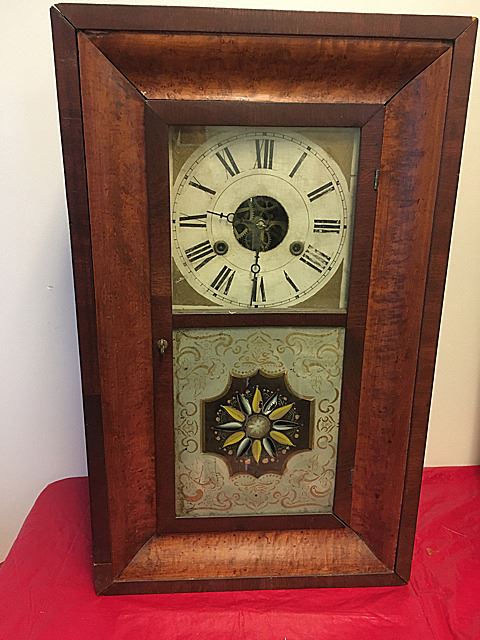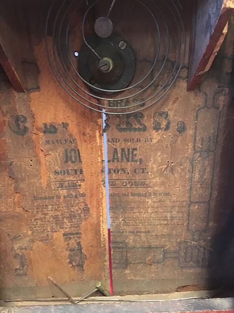 Joel A. Lane OG Shelf Clock, c. 1840's, Southington, CT. 30 hour, early brass works, weight driven with reverse painted lower glass, label, "Clarks, Manufactured and Sold by Joel A. Lane, Southington, CT. (some loss on label). Measures approx. 26" tall x 16 1/2" wide x 4 1/4" deep.