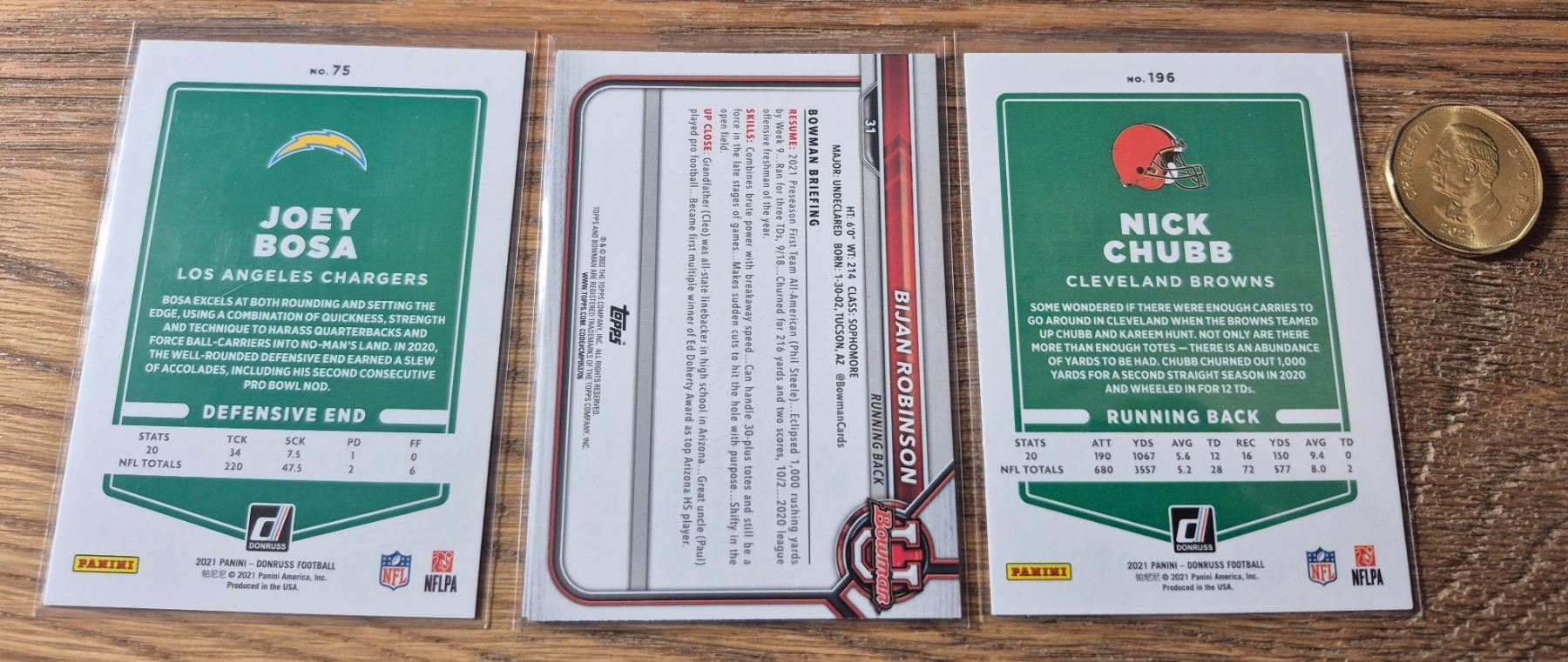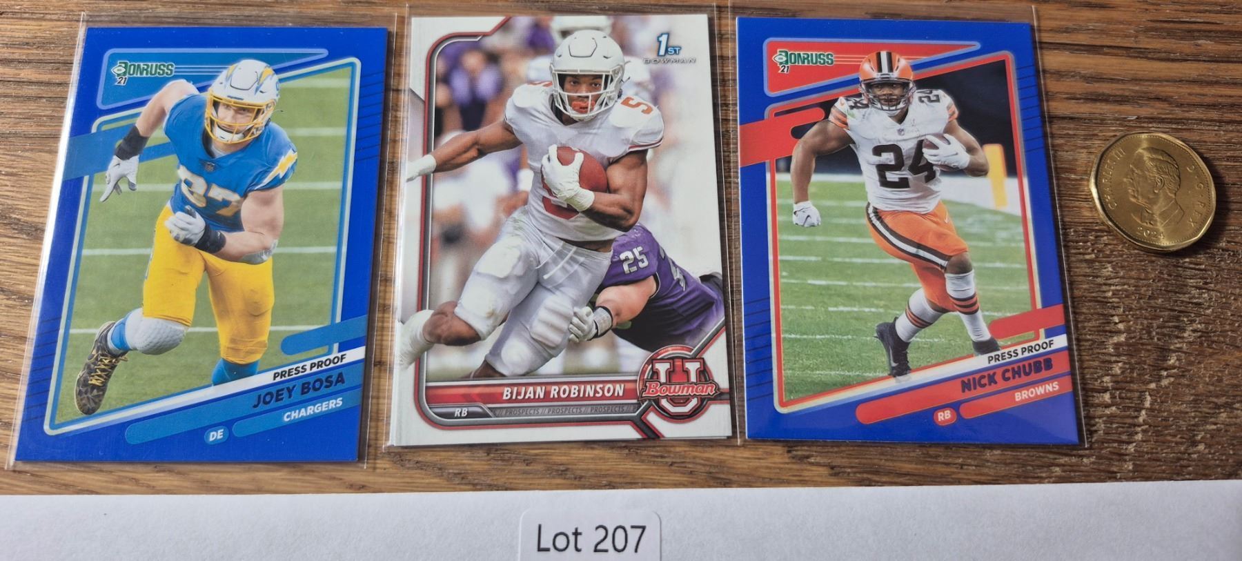 Press Proof Blue Joey Bosa and Nick Chubb plus Bowman 1st Bijan Robinson rookie. All cards in excellent to mint condition.