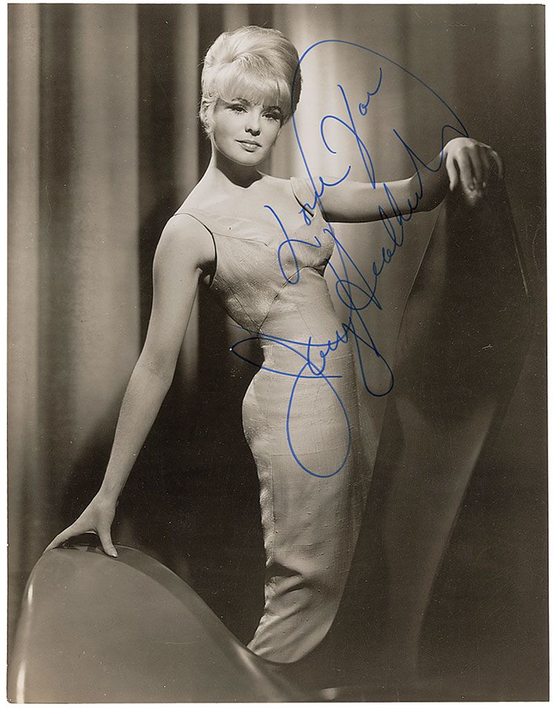 Attractive glossy 7.25 x 9.25 photo, signed in blue felt tip, “Love you, Joey Heatherton.” Light scattered marks and creases, some surface impressions across the top, and lightly trimmed edges, otherwise fine condition.