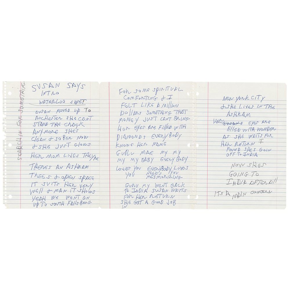 Handwritten lyrics by Joey Ramone for the song ‘Searching for Something,’ unsigned, penned in blue and black ballpoint on three off-white 8 x 10.5 notebook pages. Ramone adds the title vertically to left side, “Searchin For Something,†and then, in the upper section, he writes: “Susan Says, Intro, Waterloo Sunset.†The lyrics, in full (spelling retained): “Susan moved up to Rochester she can't stand the crack anymore shes clean & sober now & she just glows Her mom lives theyre There's an Ashram Trees & open space it suits her very well & man it shows yeah we went on up to South Fallsburg for some spiritual comforting & I felt like a million dollars something that money just can't bring her eyes are filled with diamonds everybody knows her name guru mae my my my my baby everybody loves you everybody loves you needs you mesmorizing Guru my went back to India Susan waits for her return she got a good job in New York City & she lives in the Ashram Her eyes are filled with wonder as she waits for her return I found shes goin off to India now shes going to India after all its a main concern.†In fine condition.