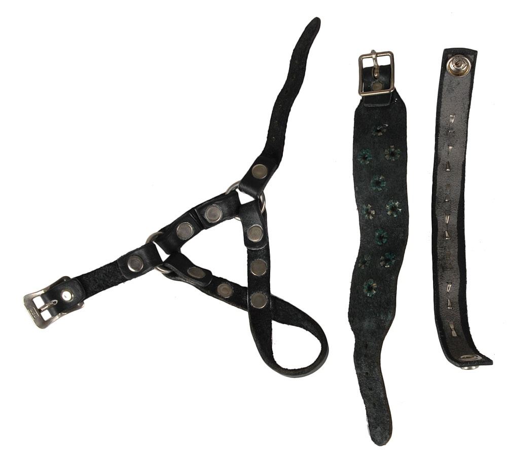 Three black leather bracelets personally-owned and -worn by Joey Ramone, including: a 9.5? finger-to-wrist ‘figure eight’ bracelet with belt buckle; an 8? bracelet with silver and black buttons and snap closure; and a 9? bracelet with studded spikes and belt buckle. In overall very good to fine condition, with expected wear from use. Accompanied by a letter of authenticity from the Joey Ramone Estate.