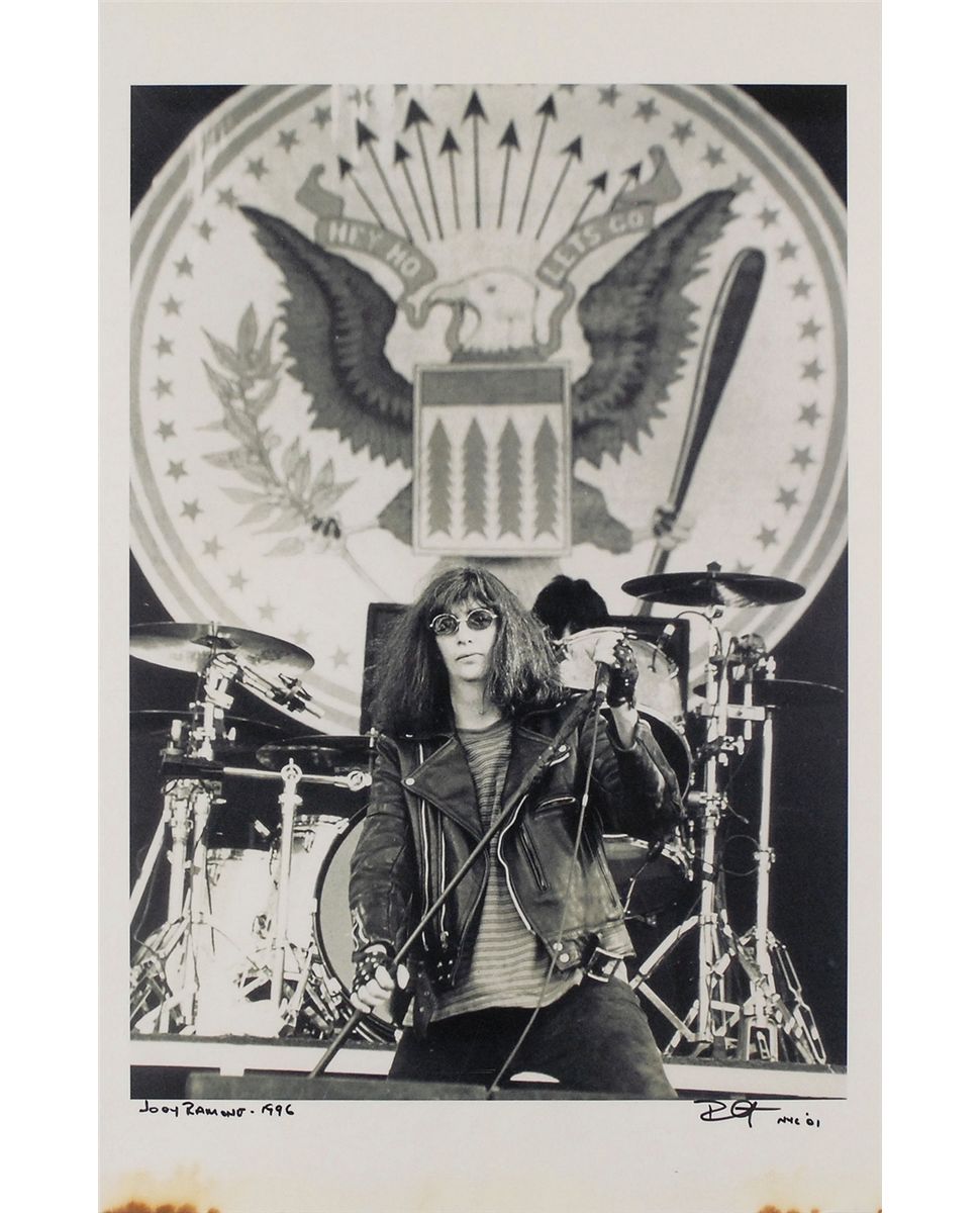 Semi-glossy 11 x 17 photo of Joey Ramone on stage, originally taken by Gruen, signed in black felt tip in the lower border by Gruen, dated 2001, and also notated by the photographer, “Joey Ramone–1996.” Rolled and in very good condition, with some toning and staining along bottom edge, which could be matted out. Accompanied by a letter of authenticity from the Joey Ramone Estate.