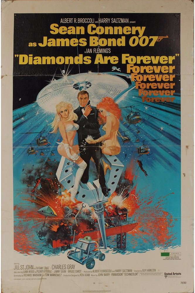 Diamonds Are Forever (United Artists, 1971). One sheet movie poster (27 x 41). Action-adventure film starring Sean Connery, Jill St. John, and Charles Gray is the seventh installment of the James Bond series by Eon Productions, in which Bond