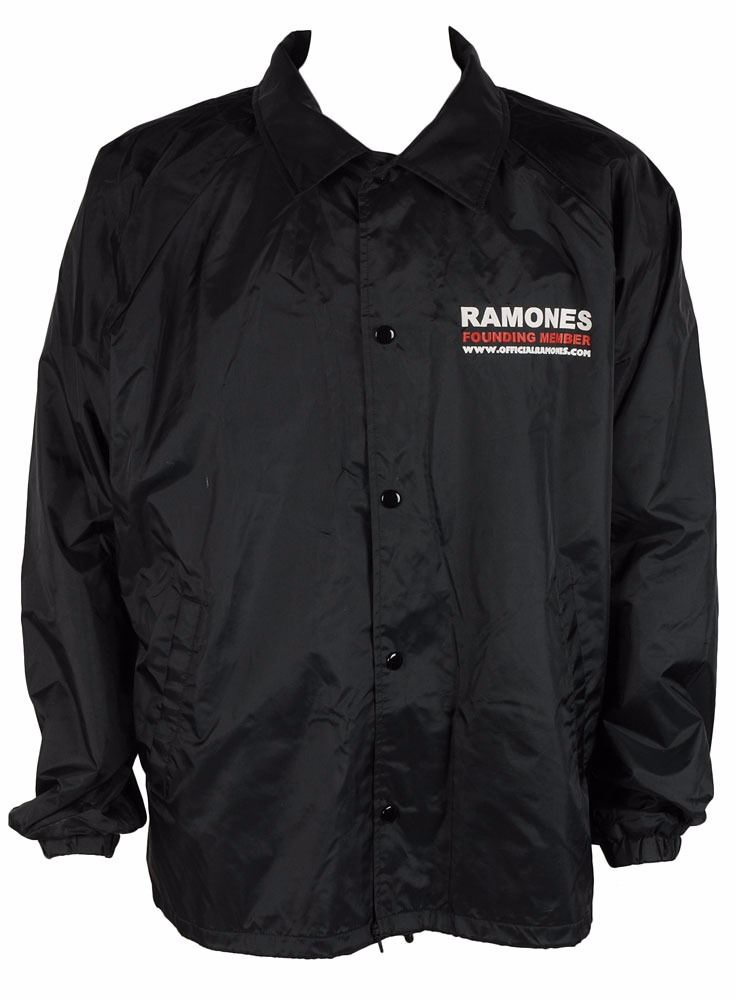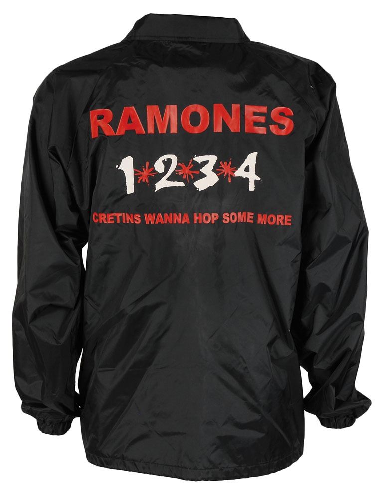 Joey Ramone’s official Ramones “Founding Member” black button-up windbreaker, size XL, made by Auburn Sportswear. Printed on the left breast is “Ramones Founding Member” and the band’s web address; the back features the band’s name in bold red lettering, with “1-2-3-4 Cretins wanna hop some more,” printed underneath. In fine condition, with some wrinkling. Accompanied by a letter of authenticity from the Joey Ramone Estate.
