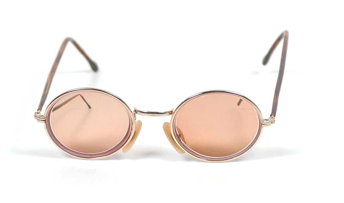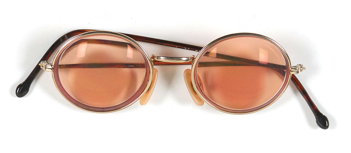Joey Ramone’s personally-owned and -worn glasses with amber-colored circular prescription lenses. Frames measure 4.5? wide with no maker identified. In fine condition, with slightly bent temples. Ramone’s sunglasses were a key part of his iconic punk rock look. Accompanied by a letter of authenticity from the Joey Ramone Estate.