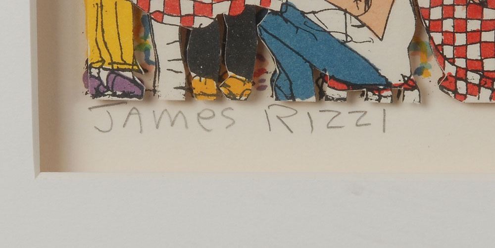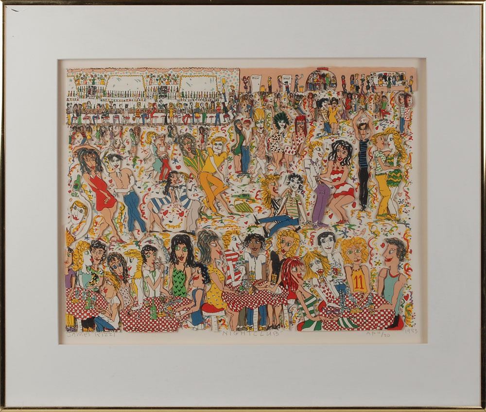 Joey Ramone’s personally-owned limited edition artwork by artist James Rizzi entitled ‘Nightclub,’ numbered AP 11/20, and signed in pencil in the lower border, “James Rizzi…1983.” The mixed media artwork depicting a hectic scene in a large nightclub, with numerous cutout figures of young people dancing, smoking, eating, and drinking at a bar. Matted and framed to an overall size of 25.75 x 21.75. In fine condition. Accompanied by a letter of authenticity from the Joey Ramone Estate. Rizzi was a pop artist from Brooklyn, New York, known for his bright and vivid three-dimensional artwork. He designed artwork for Ramone’s May 2001 memorial concert.