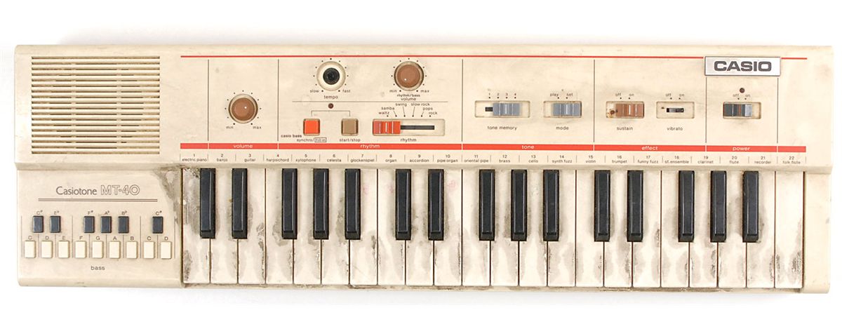 Joey Ramone’s personally-owned and -used keyboard. Off-white Casio Casiotone MT-40 keyboard measures 23? long, with adjustable rhythym selection and separate bass buttons. Keyboard has no batteries and no battery cover. In very good condition, with moderate wear and surface loss to keys and expected wear and soiling from use. Accompanied by a letter of authenticity from the Joey Ramone Estate.