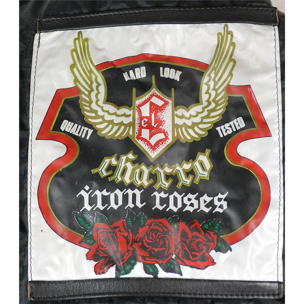 Joey Ramone’s personally-owned and -worn leather jacket. Black leather jacket has a large Charro Iron Roses label sewn into the lining and features a zip-up front, two zippered front pockets, laced leather cuffs and waist, and a colorful Charro Storm Roses image on the reverse featuring a skull and crossbones. In fine condition, with expected light wear. Leather jackets were a signature image for the band, with this one being one of the most substantial wardrobe pieces from Joey’s personal collection. Accompanied by a letter of authenticity from the Joey Ramone Estate.