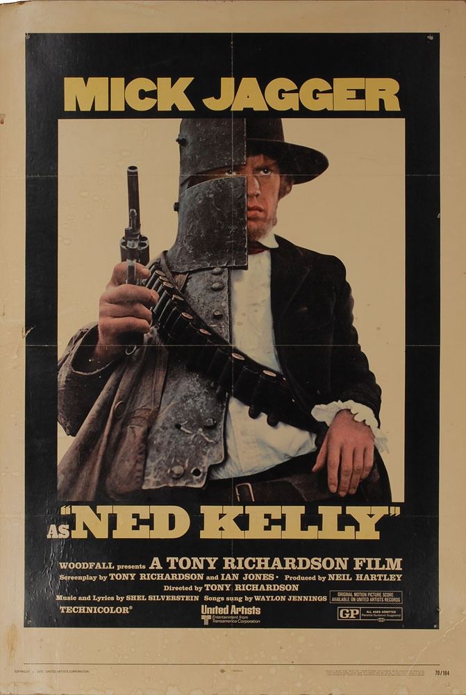 Ned Kelly (United Artists, 1970). One sheet movie poster (27 x 41). Historical western starring Mick Jagger and Mark McManus in a biographical story of the 19th century Australian bushranger Ned Kelly. The film is best remembered for its soundtrack featuring music by Shel Silverstein, Kris Kristofferson, and Waylon Jennings. Jagger claims to have never seen the film. Affixed to a same-size piece of cardboard. In very good condition, with wear and creases to edges, tack holes to corners, scattered staining, and a puncture to left side. Accompanied by a letter of authenticity from the Joey Ramone Estate.