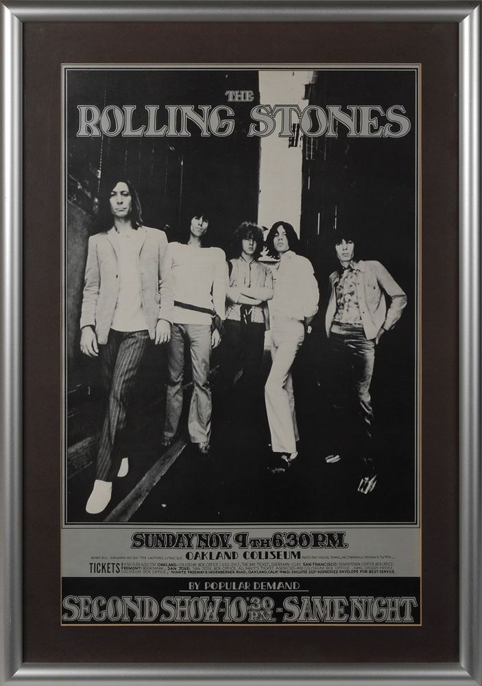 Sought-after 13.75 x 21.5 Bill Graham poster for back-to-back Rolling Stones concerts at the Oakland Coliseum on November 9, 1969, listing the show times at 6:30 and 10:30 p.m. Matted and framed to an overall size of 18.5 x 26.25. In fine condition. Accompanied by a letter of authenticity from the Joey Ramone Estate. The Stones played a a total of seven back-to-back concerts during their legendary seventeen-stop 1969 American tour.