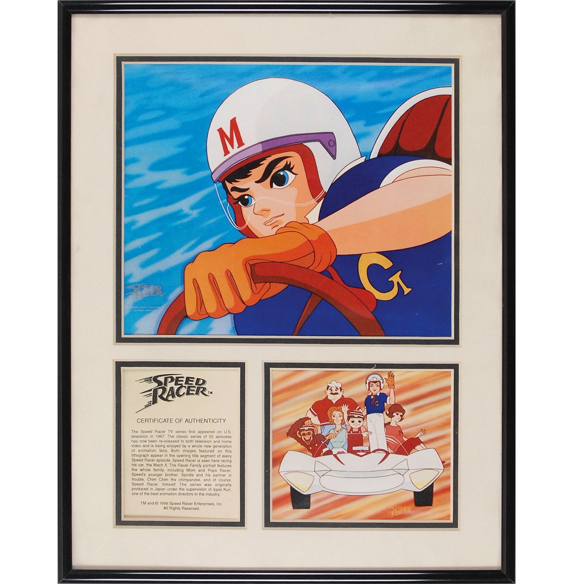 Joey Ramone’s personally-owned Speed Racer display. Display features two color images from the opening title segment, with a certificate of authenticity which states: “Both images featured on this lithograph appear in the opening title segment of every Speed Racer episode.” Double-matted and framed with the certificate to an overall size of 11 x 14.25. In fine condition. Accompanied by a letter of authenticity from the Joey Ramone Estate.