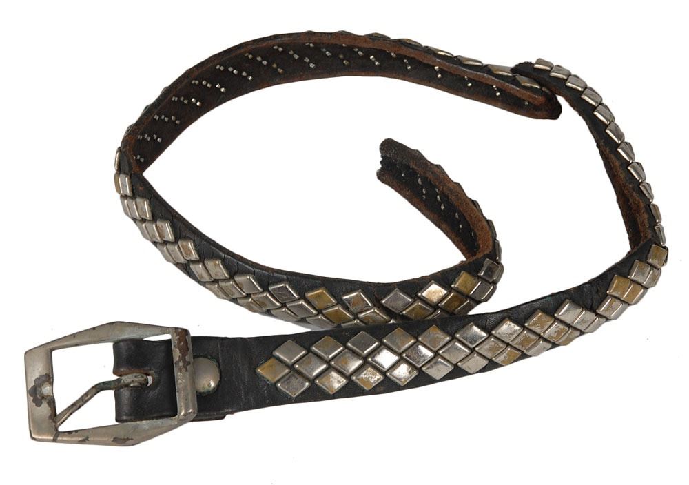 Joey Ramone’s personally-used and -worn black leather belt, 28.5? in length (complete), with scaled pattern of silver diamonds and metal buckle. In very good condition, with belt broken into two pieces, and wear to buckle. Accompanied by a letter of authenticity from the Joey Ramone Estate.