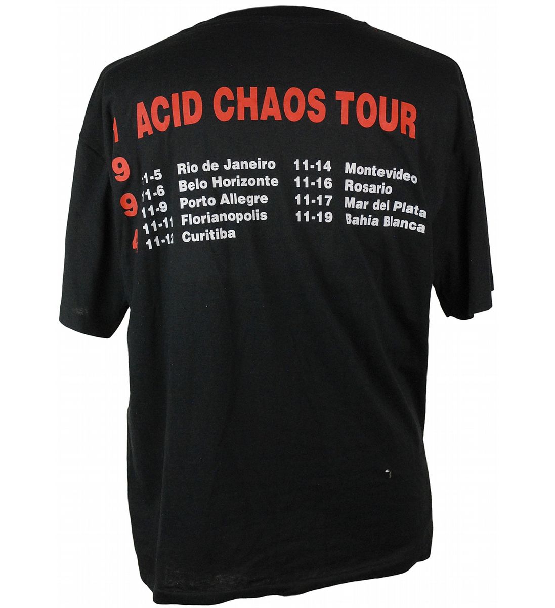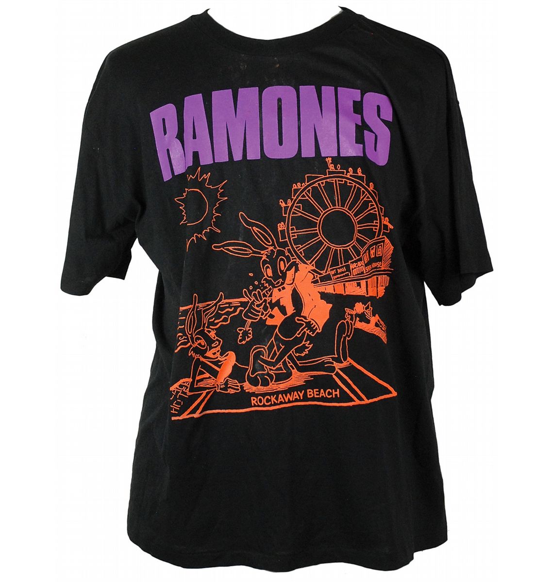 Joey Ramone’s personally-owned Ramones 1994 Acid Chaos tour T-shirt. Black T-shirt, size XL by Hanes, features an image of two rabbits at Rockaway Beach on the front, with the five South American dates printed on the reverse. In fine condition. Accompanied by a letter of authenticity from the Joey Ramone Estate.