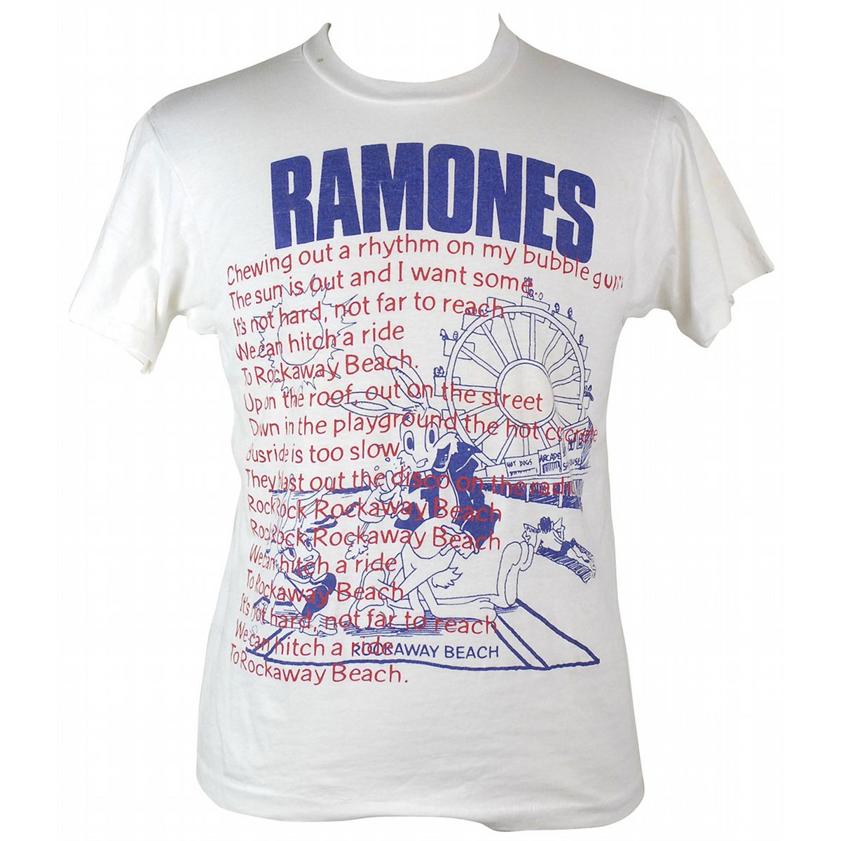 Joey Ramone’s personally-owned Ramones T-shirt. White T-shirt, size M by Screen Stars, features a cartoon image of two rabbits at Rockaway Beach, along with the printed lyrics to the song. In fine condition, with a bit of scattered light soiling. Accompanied by a letter of authenticity from the Joey Ramone Estate.