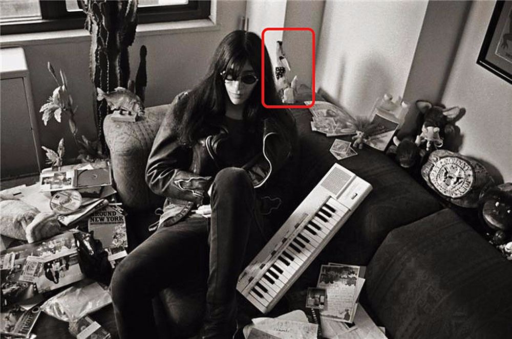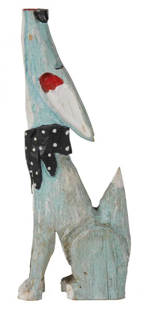 Joey Ramone’s personally-owned wooden hand-painted coyote artwork, 4 x 11 x 1.5, depicting a howling blue coyote wearing a black-and-white polka dot bandana. Bottom is etched with artist’s initials, “U. G.” In fine condition. Accompanied by a letter of authenticity from the Joey Ramone Estate.