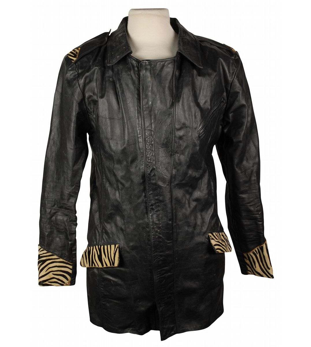 Joey Ramone’s personally owned and worn custom-made black leather jacket. Jacket features a zip-up front, a zippered left breast pocket, and is highlighted by authentic zebra skin on the pocket flaps, shoulders, and along the cuffs. In very good condition, with expected wear, and some separation to bottom of interior lining and the cuffs. Provenance: Joey Ramone Estate. Accompanied by a letter of authenticity from the Joey Ramone Estate.