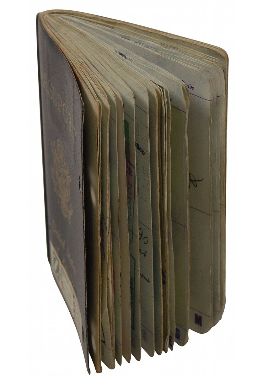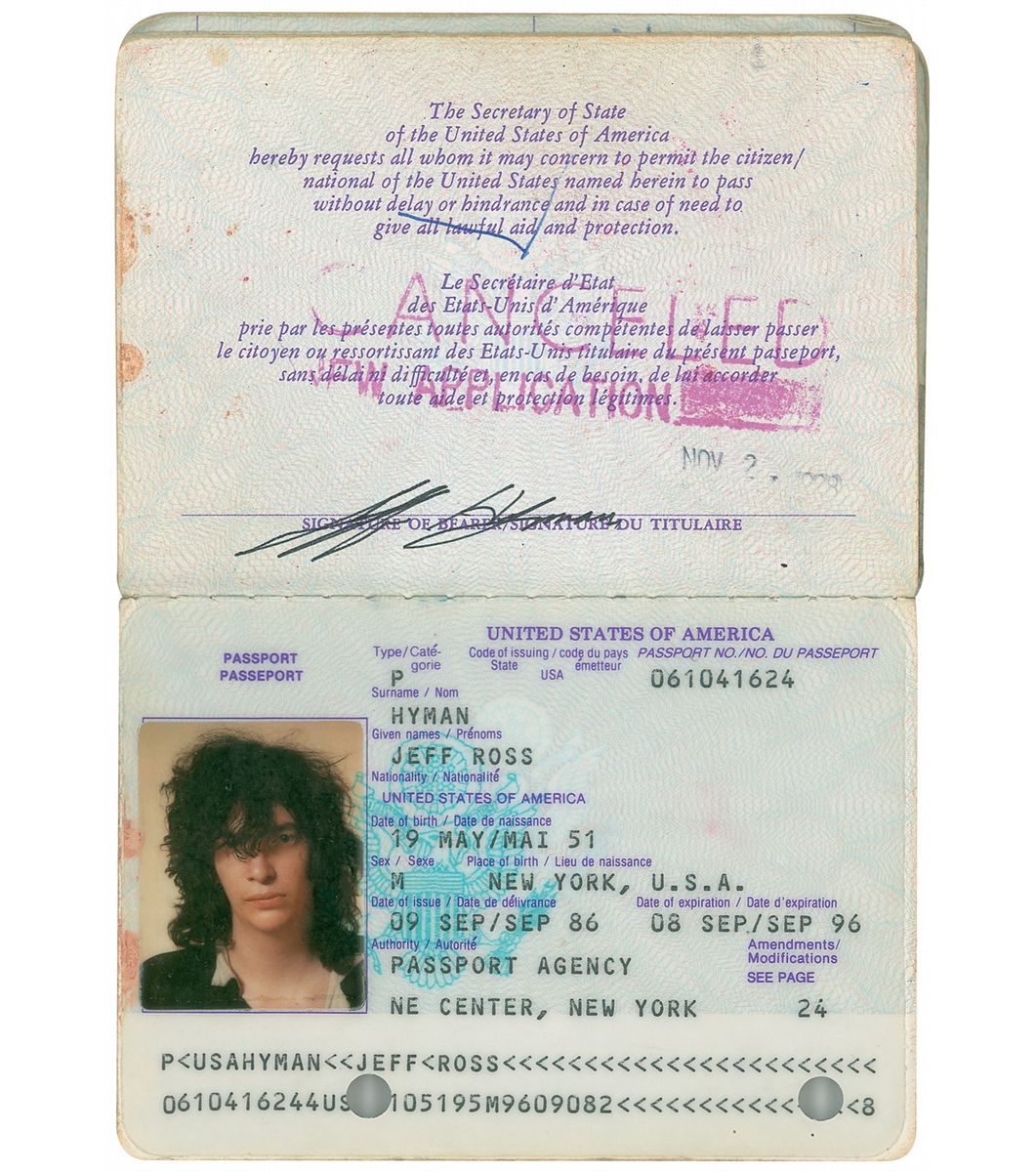 Joey Ramone’s personal passport, number 061041624, issued on September 9, 1986. Passport measures 3.5 x 5, and contains his printed personal information on the inside front cover, signed on the adjoining page in black ink with his real name, “Jeff Hyman.” Affixed on the personal information page is a 1.5 x 1.75 passport snapshot. Forty-four of the inside pages are stamped on both sides with entry stamps and some affixed work visas and permits from around the world including London, Japan, Argentina, Italy, Brazil, Denmark, Australia, New Zealand, the Bahamas, Canada, Norway, Canada, and New York City. Stamps date from the late 1980s to 1996. Expected wear from use, two punch holes to front cover, and several labels affixed to covers, otherwise fine condition. Provenance: Joey Ramone Estate. Accompanied by a letter of authenticity from the Joey Ramone Estate. A very personal and one-of-a-kind item, enhanced by his uncommon legal signature, and also showcasing the band’s willingness to play anywhere and anytime.