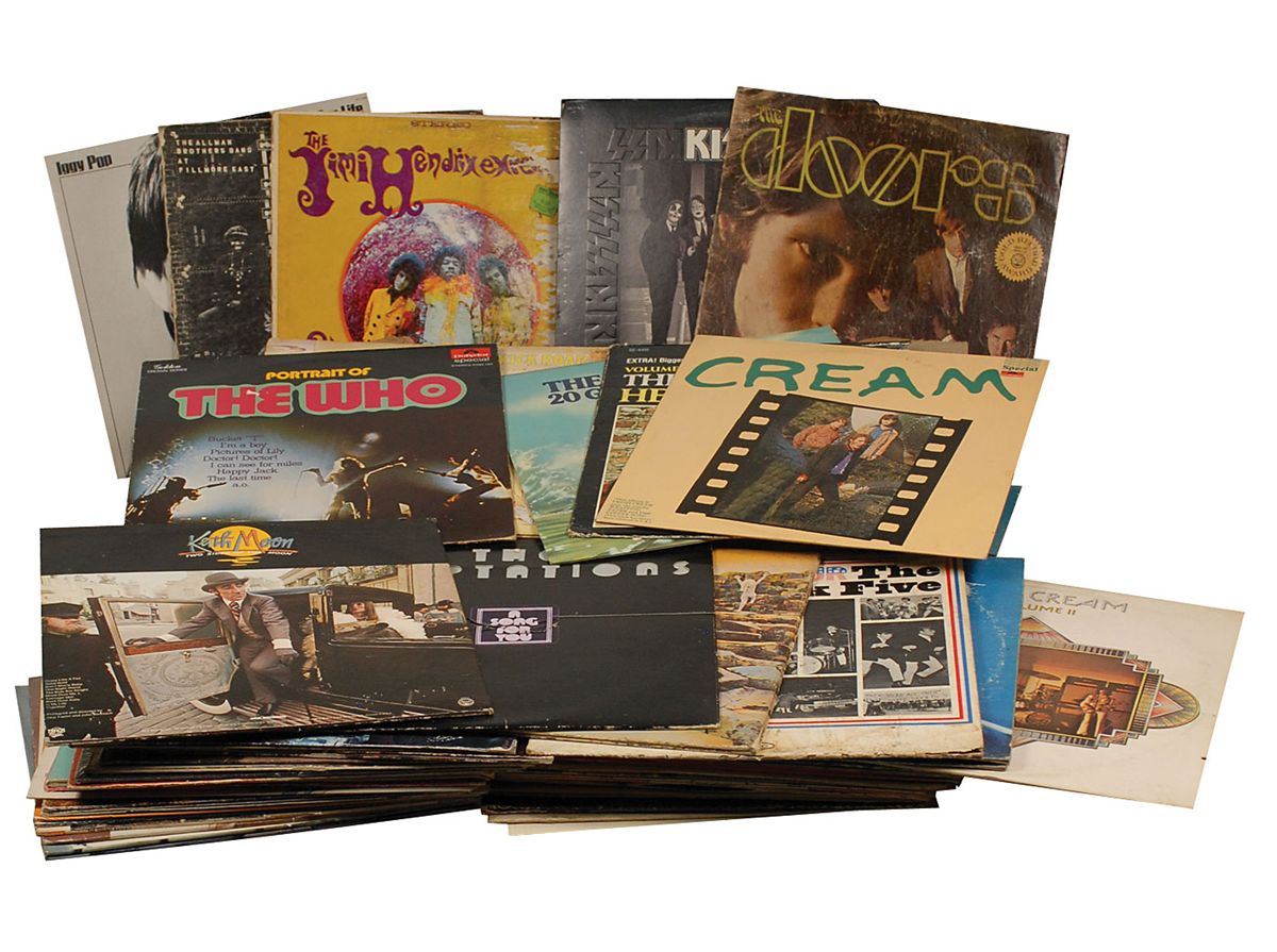 Joey Ramone’s personal record collection, consisting of 97 records in their original album sleeves. Some artists include Led Zeppelin, the Who, T. Rex, Cream, Bob Dylan, The Human League, Iggy Pop, the Doors, the Temptations, and the Ventures. In overall very good to fine condition, with various scattered creases and small tears to sleeves, affixed prices tags and labels, and marks to vinyl. Provenance: Joey Ramone Estate. Accompanied by a letter signed by Joey’s brother Mickey attesting to the collection’s authenticity.