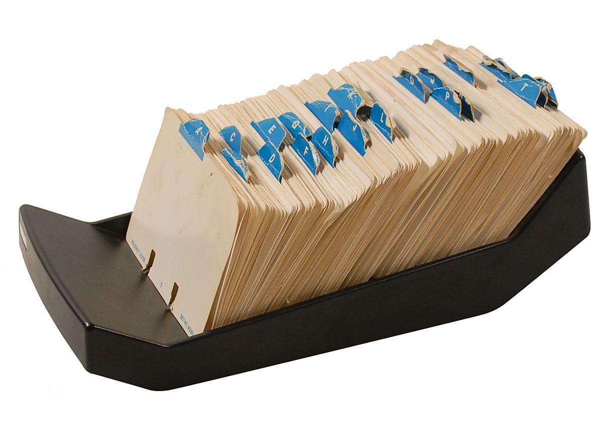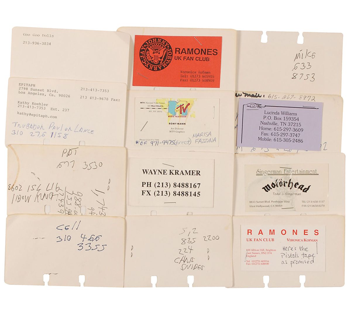 Joey Ramone’s personal Rolodex, 5.5 x 3.5 x 10, consisting of numerous cards bearing typed addresses or stapled business cards of Ramone’s associates. Some interesting business cards include Ramone’s personal Addicted to Noise card, Arista Records, Rock 'n' Roll High School producer Allan Arkush, Epitaph Records, EMI Records, Footlight Records, Geffen Records, rock ‘n’ roll photographer Bob Gruen, Instinct Records, Wayne Kramer, Lucinda Williams, MCA Records, a few different people at MTV, Rip magazine, the Ramones UK Fan Club, Spin Records, Motorhead’s agent, and a few different radio stations, including K-Rock. Typed phone number and address cards for the Bottom Line venue, a CBGB booking agent, Stan Lee of the Dickies, the Goo Goo Dolls, and Sire Records are included. Epitaph Records and Lucinda Williams cards both bear ballpoint notations in Ramone’s hand. Five cards also have phone numbers and other notations to the reverse in Ramone’s hand. His rolodex also reveals an affinity for fine Japanese cuisine. Expected wear from use, including creases to corner tips and letter tabs, otherwise fine condition. Provenance: Joey Ramone Estate. Accompanied by a letter of authenticity from the Joey Ramone Estate.