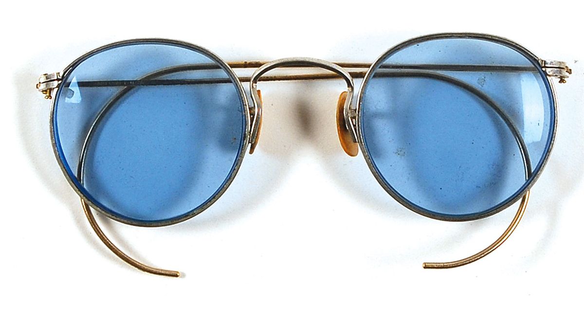 Metal eyeglasses with light blue prescription lenses, 5 inches wide, no maker identified. In very good condition, with frames relatively bent but structurally sound. Accompanied by a black plastic glasses case. Provenance: Joey Ramone Estate. Accompanied by a letter of authenticity from the Joey Ramone Estate.