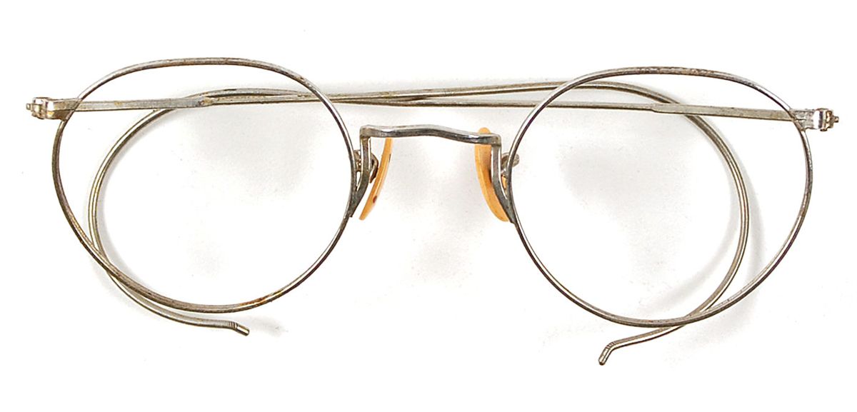 Metal eyeglasses frames without lenses, 5 inches wide, no maker identified. In very good condition, with frames relatively bent but structurally sound. Accompanied by a brown glasses case and cleaning cloth from optometrist Nevile Robinson in London. Provenance: Joey Ramone Estate. Accompanied by a letter of authenticity from the Joey Ramone Estate.