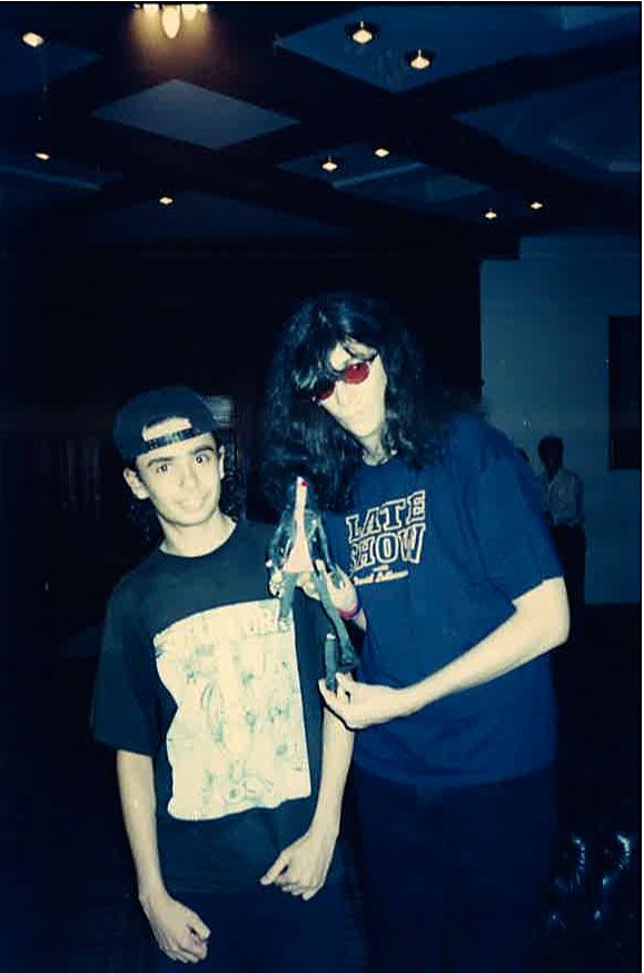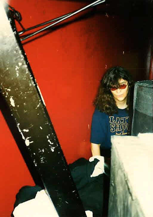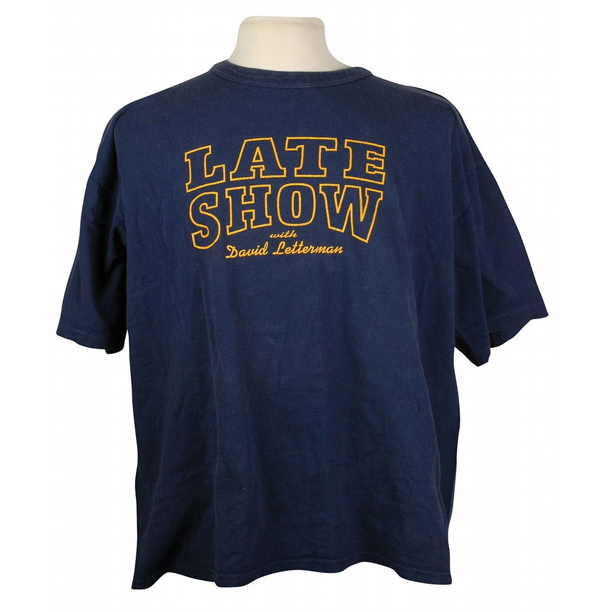 Joey Ramone’s stage-worn t-shirt. Navy blue t-shirt for the Late Show with David Letterman. In fine condition, with expected wear and tag missing. Accompanied by four photos of Joey wearing the shirt, including one of him wearing it on stage. Provenance: Joey Ramone Estate. Accompanied by a letter of authenticity from the Joey Ramone Estate.