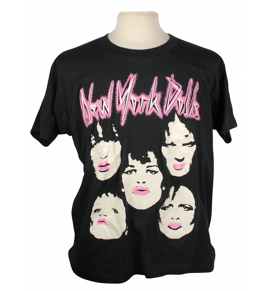 Joey Ramone’s personally owned and worn t-shirt. Black t-shirt, size XL by Screen Stars, is for the band The New York Dolls and bears ‘floating head’ images of the five musicians and the band’s name. In fine condition, with expected wear. Accompanied by three photos of Joey wearing the shirt. Provenance: Joey Ramone Estate. Accompanied by a letter of authenticity from the Joey Ramone Estate.