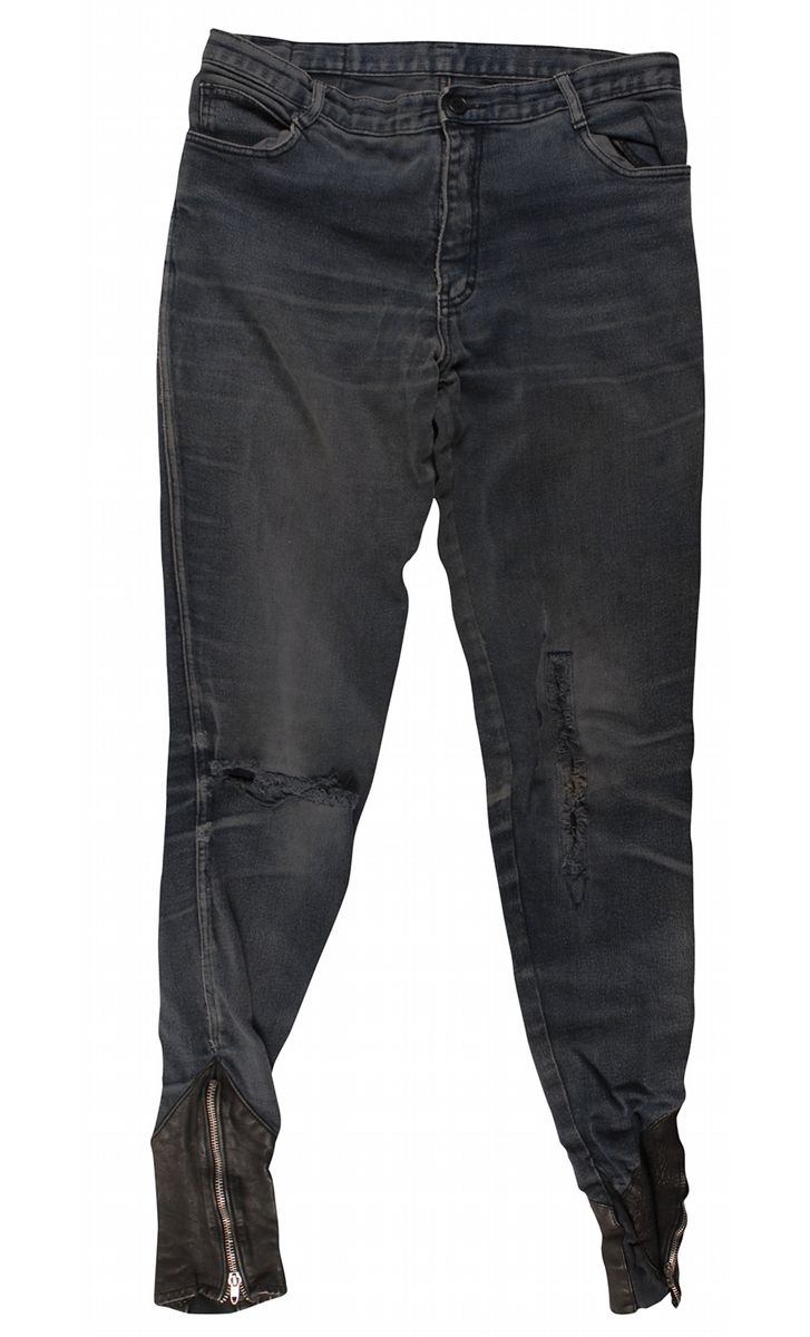 Joey Ramone’s personally owned and worn Fizzy jeans. Dark denim Fizzy jeans by Cykxtees, size 14, have zip-up leather cuffs, and a rip to both knees. In fine, worn condition. Provenance: Joey Ramone Estate. Accompanied by a letter of authenticity from the Joey Ramone Estate.
