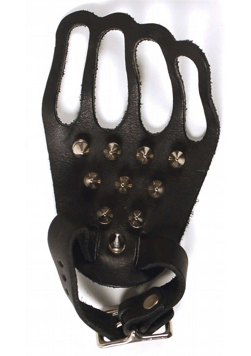 Joey Ramone’s custom-made fingerless leather glove. Black leather glove has an adjustable buckle at the wrist and is adorned with 10 metal studs arranged in a triangle formation. In fine condition. Provenance: Joey Ramone Estate. Accompanied by a letter of authenticity from the Joey Ramone Estate.