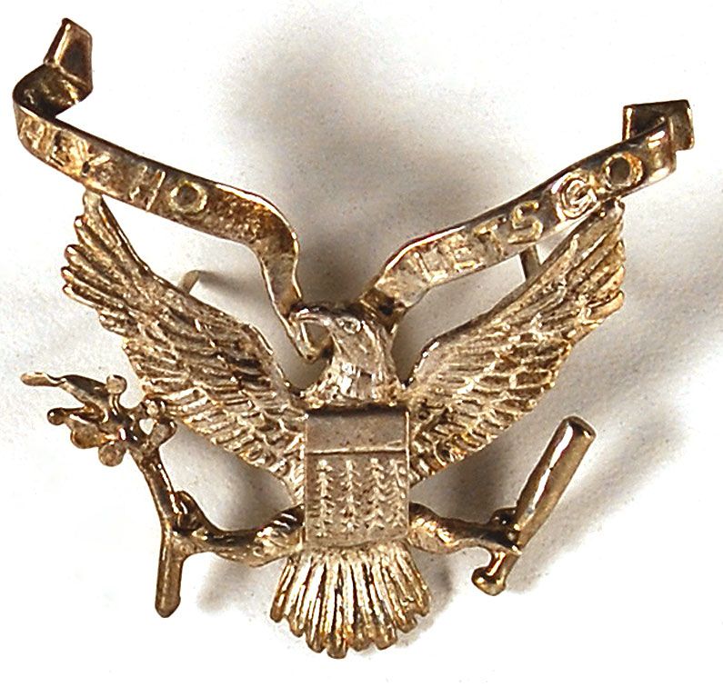 Joey Ramone’s personally owned and worn silver lapel pin. Pin shows the band’s classic eagle with its wings outstretched, an apple tree branch and baseball bat in its talons, with the scroll bearing the first line from ‘Blitzkrieg Bop,’ “Hey Ho Let’s Go.” In fine condition. Provenance: Joey Ramone Estate. Accompanied by a letter of authenticity from the Joey Ramone Estate.