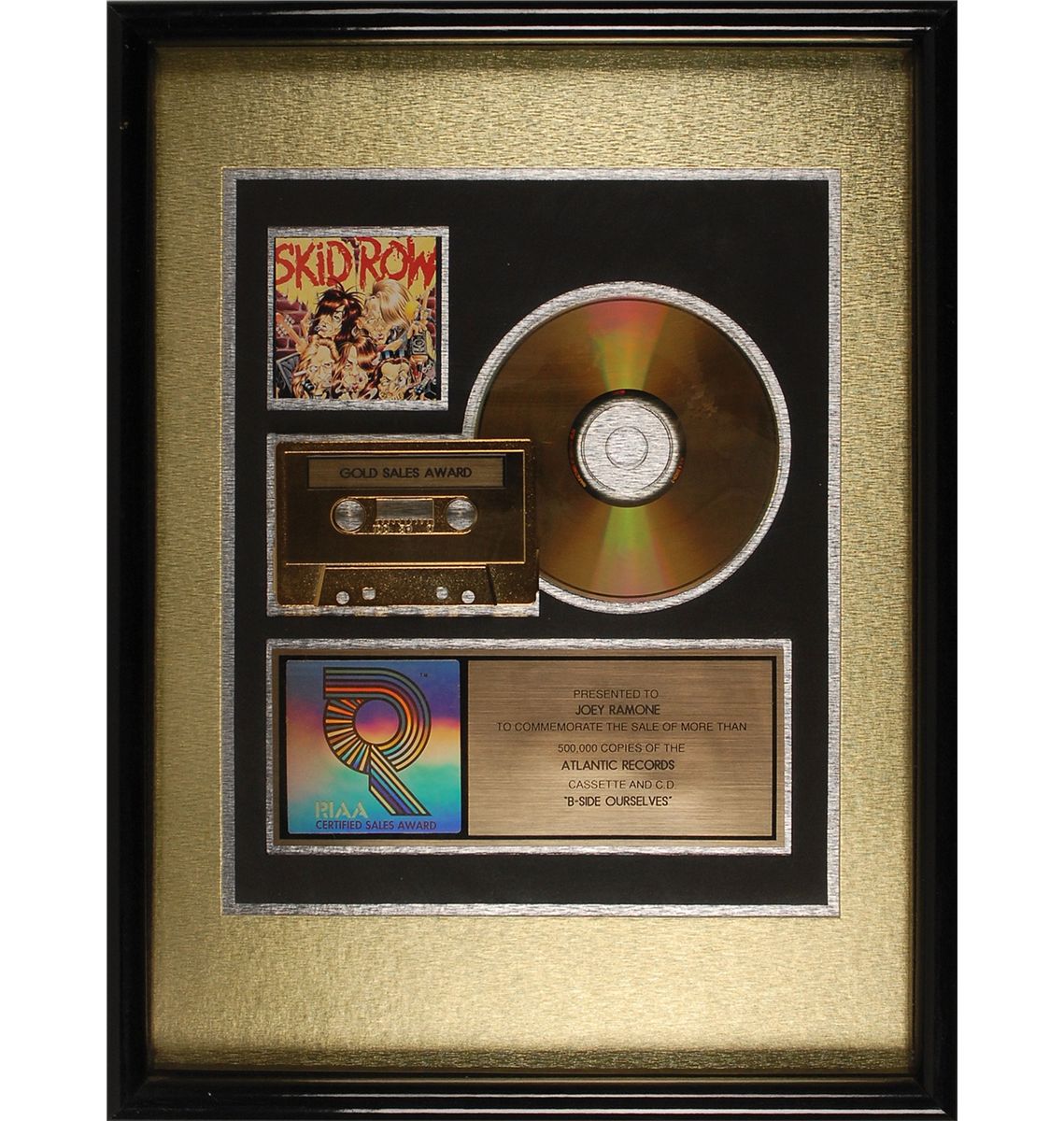 Official RIAA hologram gold sales award presented to Joey Ramone to commemorate the sale of 500,000 copies of Skid Row’s EP B-Side Ourselves. Double-matted and framed with a gold cassette and CD, a small image of the cover art, and the presentation plaque, to an overall size of 13 x 17. In fine condition. The EP was certified gold in 1993. The Ramones’ song ‘Psycho Therapy,’ was included on the album, and Joey Ramone appeared in the band’s No Frills video. Provenance: Joey Ramone Estate. Accompanied by a letter of authenticity from the Joey Ramone Estate.