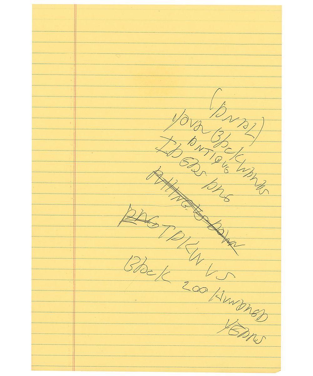 Handwritten lyric fragments from an unidentified song on a yellow 8 x 12 lined sheet of legal paper. Ramone writes several lines in black ballpoint, “(Anal) Your backwards antique ideas are takin us back 200 hundred years.” In fine condition, with scattered light wrinkles and creases. Provenance: Joey Ramone Estate. Accompanied by a letter of authenticity from the Joey Ramone Estate.