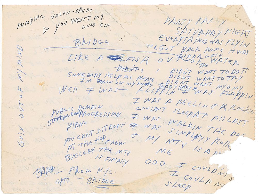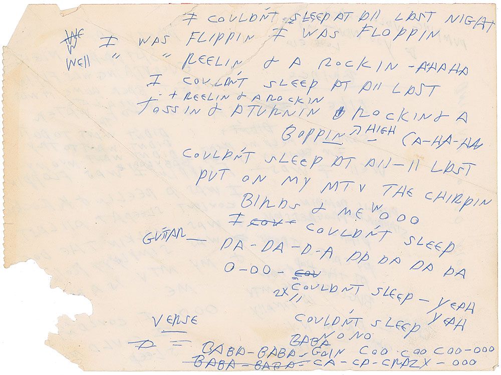 Handwritten lyrics to the Joey Ramone song ‘I Couldn’t Sleep,’ on both sides of an off-white 12 x 9 sheet. An early version of the song, titled along the side “Goin Out of My Mind,” Ramone writes out in blue ballpoint, in part; “I couldn’t sleep at all last night/I was flippin I was floppin/Well I was reelin & a rockin-Ahaha/I couldn’t sleep at all last/Tossin & a turnin & reelin & a rockin rockin & a boppin…Couldn’t sleep at all-ll last/Put on my MTV the chirpin birds & me wooo.” Ramone adds a guitar part underneath and two more verses on the reverse. On the reverse he also adds a few more notes, presumably more of the song, “Public Domain, standard rock progression, piano, you can’t sit down at the hop & now the MTV is finally from N.Y.C.” Paper loss to one corner affecting a few words of text, tear to top edge, moderate creases, and scattered light toning and soiling, otherwise very good condition. Written sometime between 1977 and 2000, ‘I Couldn’t Sleep’ was featured on Ramone’s second, and final, solo album, Ya Know? Provenance: Joey Ramone Estate. Accompanied by a letter of authenticity from the Joey Ramone Estate.
