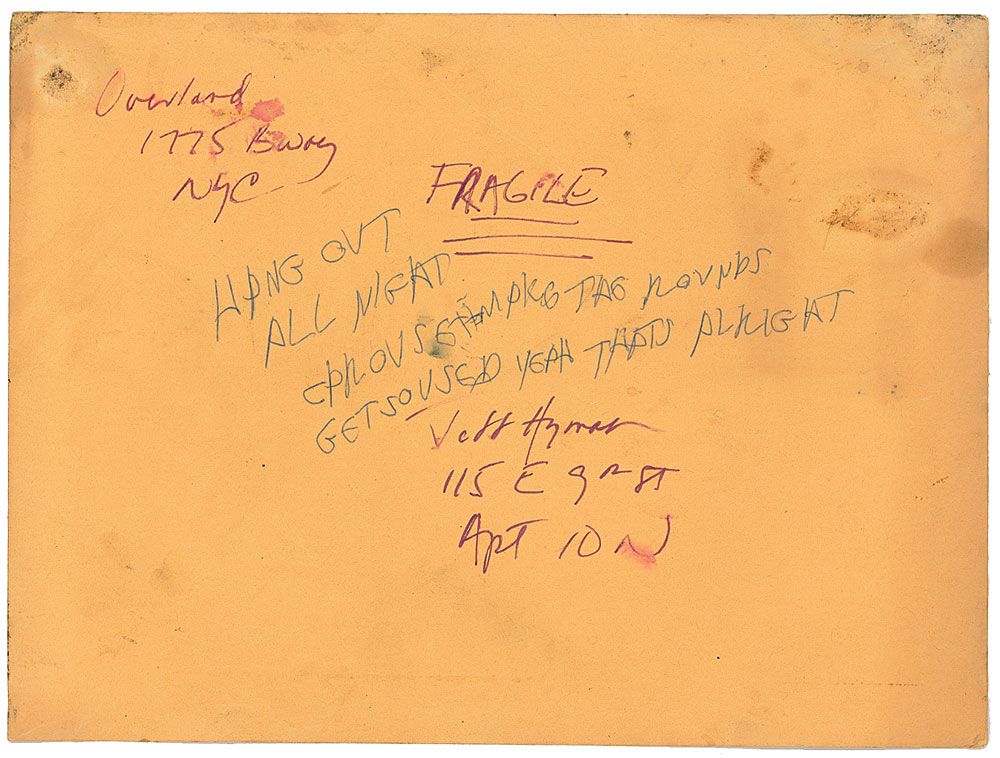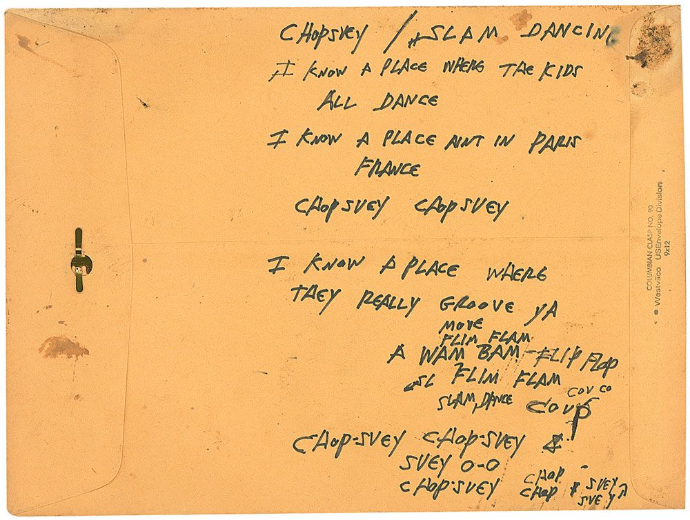 Handwritten lyrics to the Ramone’s song ‘Chop Suey,’ on the back of a 12 x 9 off-white mailing envelope. A work in progress, Joey pens the first verses and chorus of ‘Chop Suey,’ in black felt tip, writing the title at the top, along with “Slam Dancing.” In full: “I know a place where the kids all dance/I know a place ain’t in Paris France/Chop Suey Chop Suey/I know a place where they really groove ya/A wam bam flip flop flim flam/slam dance coup/ Chop Suey Chop Suey/Suey O-O/Chop Suey/Chop Chop/Suey Suey.” Joey had added a few notations to the front of the envelope, in part, “Hang out all night…Get Soused yeah that’s alright.” Envelope is addressed to Ramone, using his real name, and sent from Overland in the Bowery. In fine condition, with scattered toning and soiling. ‘Chop Suey’ was featured on the soundtrack for the 1983 cult favorite film Get Crazy. The song was also an outtake from Pleasant Dreams, with backing vocals by Deborah Harry, and Kate Pierson and Cindy Wilson of the B-52s. Provenance: Joey Ramone Estate. Accompanied by a letter of authenticity from the Joey Ramone Estate.