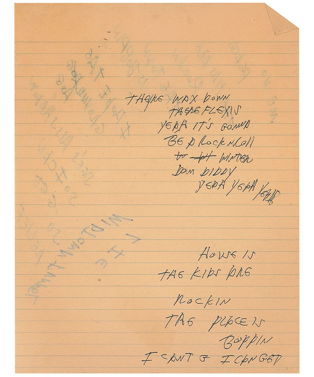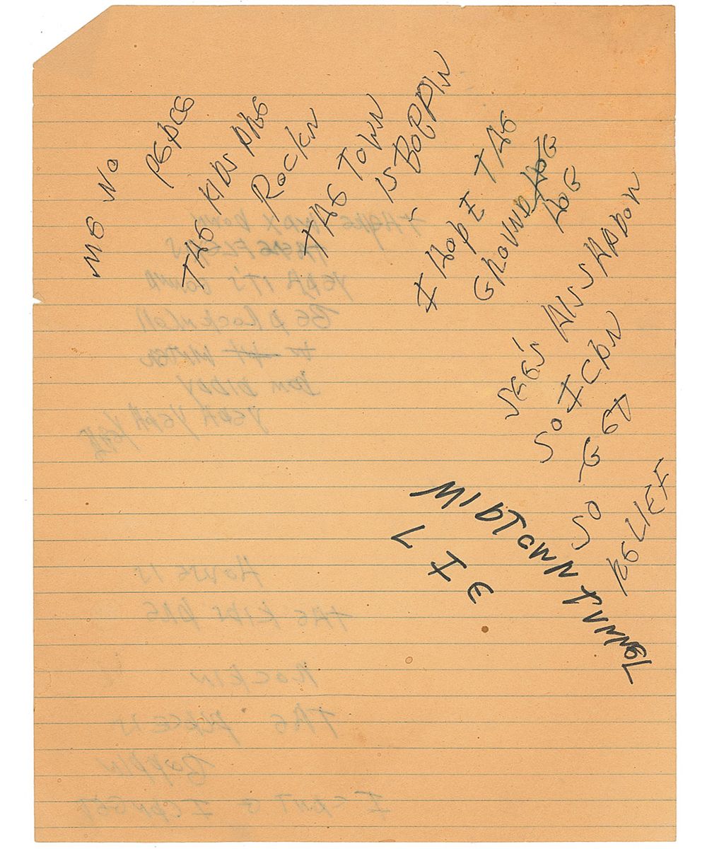 Handwritten lyrics to an unidentified song on both sides of an 8.5 x 11 lightly-lined off-white sheet. Joey writes several verses in black ballpoint, in part; “Yeah it’s gonna be a Rock n Roll winter/Dom Diddy yeah yeah yeah/House is the kids are rockin/The place is boppin/I can’t I can’t get me no peace…I hope the groundhog see’s his shadow so I can get so[me] relief.” Also written in black felt tip by Joey is “Midtown Tunnel LIE.” Scattered light creases and edge tears, and a uniform shade of toning, otherwise fine condition. Provenance: Joey Ramone Estate. Accompanied by a letter of authenticity from the Joey Ramone Estate.