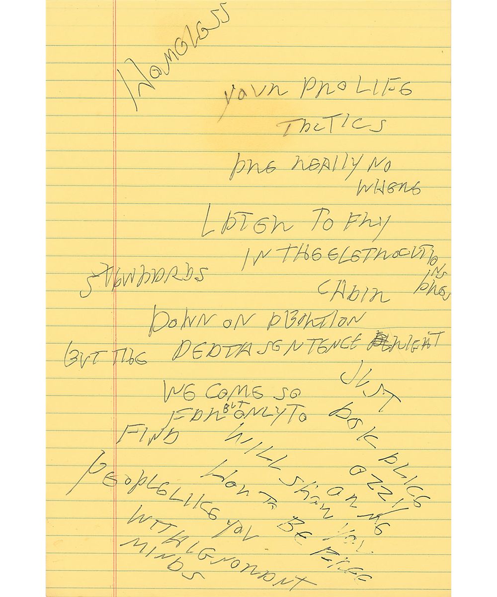 Handwritten lyrics to a portion of the Ramones’ song ‘Censorshit’ on an 8 x 12 lightly-lined yellow sheet. Joey writes a couple of verses in black ink, some of which appeared in the final version of the song. Ramone writes, in part: “Your prolife tactics are really nowhere/Later to fry in the electrocutioners chair/Down on abortion but the death sentence alright/Just ask Alice Ozzy an me/Will show you how to be free/We come so far but only to find people like you with ignorant minds.” In fine condition, with central horizontal fold, a few creases, and a couple of light spots. The song was featured on the band’s 1992 album Mondo Bizarro, and was written by Joey to Tipper Gore and the PMRC (Parents Music Resource Center) about how rap and rock n’ roll albums were being censored. Provenance: Joey Ramone Estate. Accompanied by a letter of authenticity from the Joey Ramone Estate.