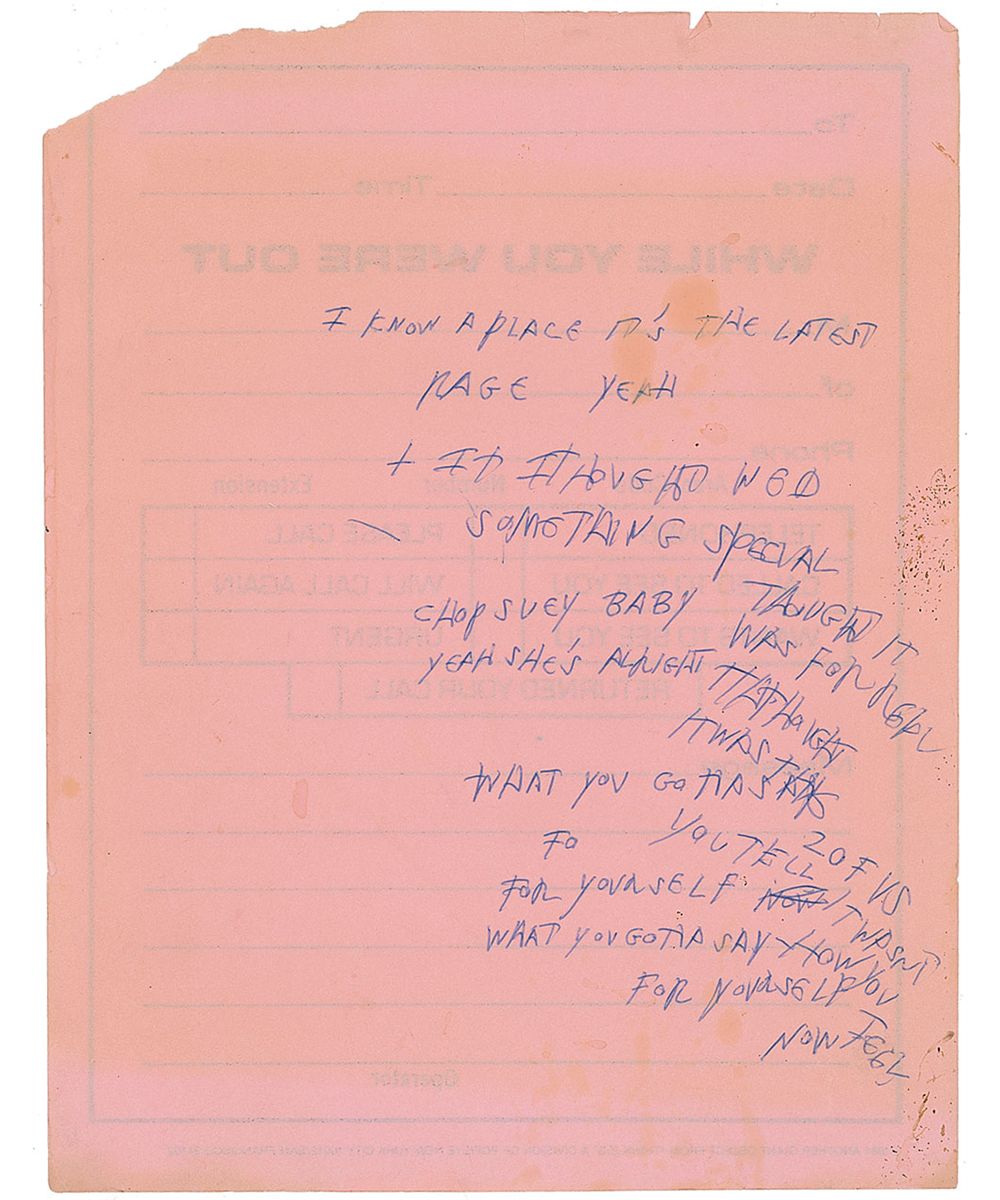 Handwritten lyrics by Joey Ramone for the band’s song ‘Chop Suey’ on the reverse on a light pink 8.5 x 11.5 message sheet. Ramone writes a portion of working lyrics for the song, in part: “I know a place it’s the latest rage yeah/Chop suey baby/yeah she’s alright,” with Ramone adding two different sets of overlapping lyrics to the remainder. Paper loss to one corner, edge wear, and scattered light creases, wrinkles, and toning. Provenance: Joey Ramone Estate. Accompanied by a letter of authenticity from the Joey Ramone Estate.