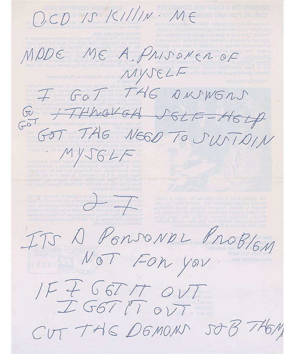 Handwritten lyrics to an unidentified, and possibly unpublished, song on the reverse of an off-white 8.5 x 11 National Academy of Recording Arts and Sciences newsletter page, postmarked November 16, 1994. The lyrics read, “OCD Is Killing Me/Made me a prisoner of myself/I got the answers/Got the need to sustain myself/& I It’s a personal problem not for you/If I get it out/I get it out/Cut the demons stab them.” In fine condition, with a central horizontal fold. Provenance: Joey Ramone Estate. Accompanied by a letter of authenticity from the Joey Ramone Estate.