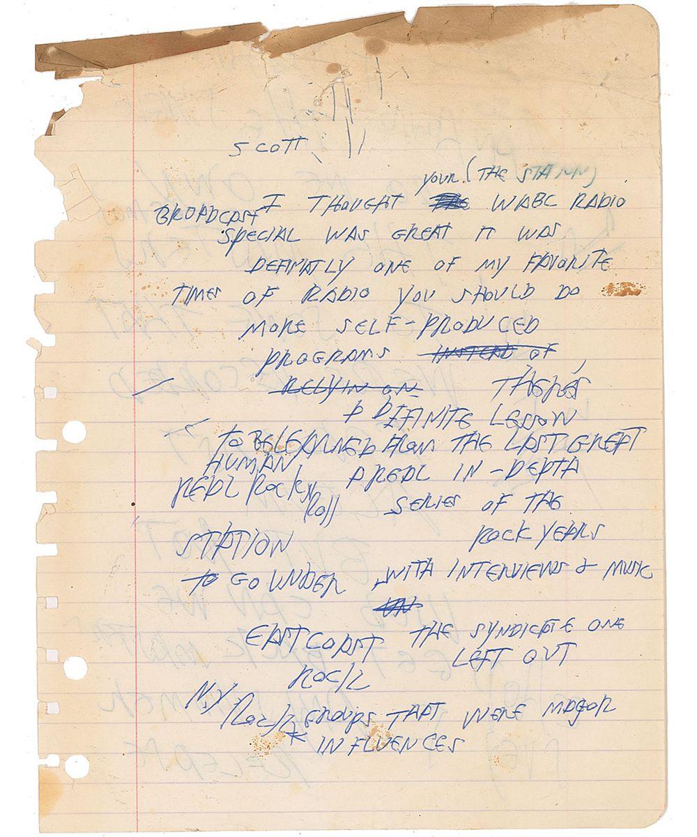 Autograph letter, one page both sides, 8 x 10.5, no date. Letter addressed to “Scott.” In full (with spelling and grammar retained): “I thought your (the station) WABC radio broadcast special was great it was definitely one of my favorite times of radio you should do more self-produced programs. There’s a definite lesson to be learned from the last great human & real in-depth real Rock N Roll station series of the rock years to go under with music & interviews. East coast rock, the syndicate one left out N. Y. Rock groups that were major influences…The single do we own the masters or demos to song that were recorded for last album but not used can we get back masters Chop Suey & any summer release.” Tears to top edge, scattered toning and dampstaining, a bit affecting a few words of text, rough vertical edge, and a few other stray ink marks and notations, otherwise very good condition. Provenance: Joey Ramone Estate. Accompanied by a letter of authenticity from the Joey Ramone Estate.