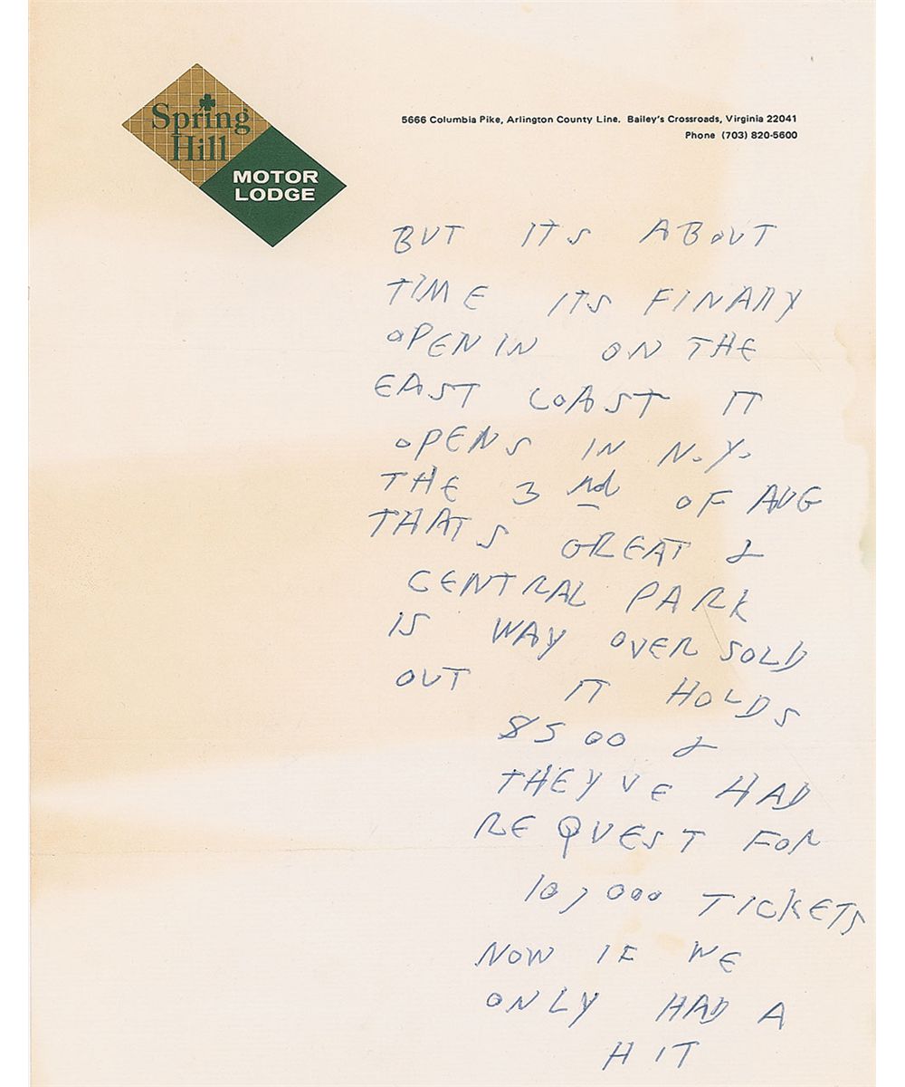 Partial autograph letter, one page, 8.5 x 11, Spring Hill Motor Lodge letterhead, no date. From a motel in Virginia, Ramone writes (with grammar and spelling retained): “But its about time its finally openin on the East coast it opens in N. Y. The 3rd of Aug thats great & Central Park is way over sold out it holds 8500 & theyve had request for 10,000 tickets now if we only had a hit.” Several light blocks of toning over portions of text and scattered light creases and wrinkles, otherwise fine condition. Rock ‘n’ Roll High School premiered in New York on August 4, 1979 and went on to become a cult classic. On August 6, 1979, the Ramones played Central Park as part of the Dr. Pepper Central Park Music Festival. Provenance: Joey Ramone Estate. Accompanied by a letter of authenticity from the Joey Ramone Estate.