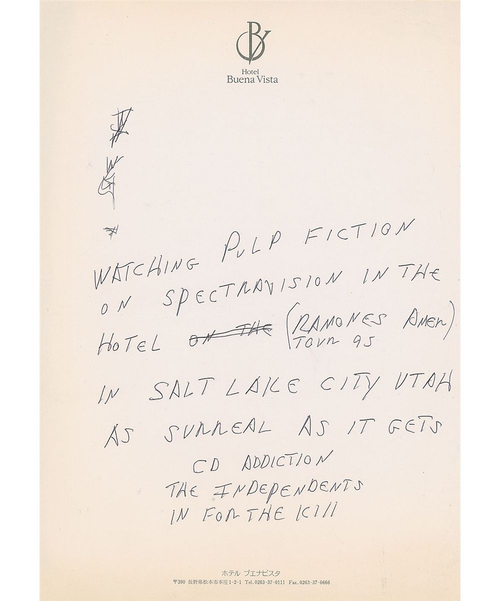 Handwritten notes by Joey Ramone on an off-white 8.25 x 11.5 sheet of Hotel Buena Vista stationery in Matsumoto, Japan. Ramone writes, in full: “Watching Pulp Fiction on Spectravision in the hotel (Ramones Amer tour 95) in Salt Lake City Utah as surreal as it gets. CD addiction the independents in for the kill.” In fine condition, with a few scattered creases and a bit of toning. The Ramones had a stop in Matsumoto on October 22, 1995, during their final Adios Amigos tour. Joey kept a road diary for MTV during the tour. Provenance: Joey Ramone Estate. Accompanied by a letter of authenticity from the Joey Ramone Estate.